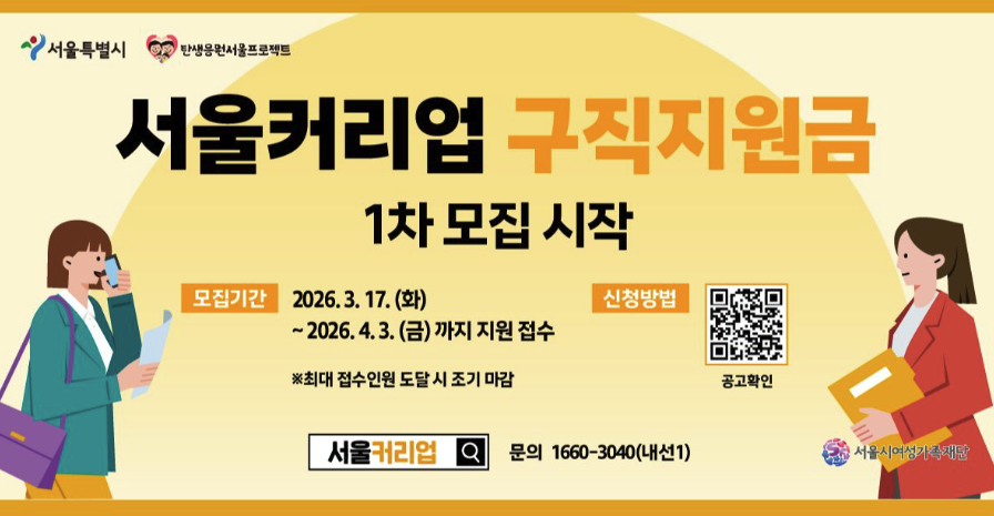 서울커리업 구직지원금은 결혼·임신·출산·양육으로 경력이 단절된 서울 거주 만 30~49세 여성에게 월 30만 원씩 3개월, 최대 90만 원을 지원하는 서울시 여성 일자리 사업입니다. 2026년 1차 모집은 3월 17일부터 4월 3일까지 온라인으로 접수하며, 총 1,800명을 우선 선발합니다. 자격 조건과 신청방법을 지금 확인하세요.
